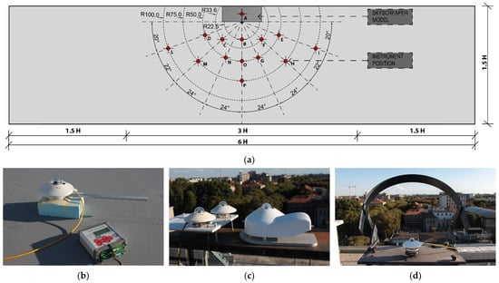 (a) 6 H × 1.5 H measurement plane (H is the height of the Skyscraper model that in the presented experiment is equal to 1 m) with measurement positions. (b) Moveable albedometer (CMA11) with Datalogger. (c) Pyranometer CM21 and CM22 are part of the weather station that provides undisturbed reference values. (d) Pyranometer CM6 with shadow-band that provides undisturbed reference values.
