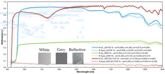 Figure 4 also shows both total and specular excluded reflectance of the background plane used. This grey surface was selected because it represents the standard urban surface with an albedo of 0.35 [51,52,53].