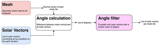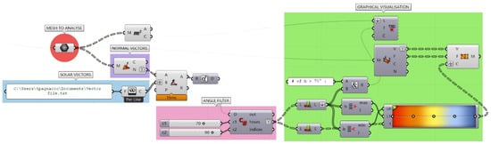 The working flow proposed (Figure 6) lists the incident solar rays coupled with the related normal vector of every mesh tile. This approach allowed the script to correlate the initial vector list with the angular degree, excluding (by the use of filters) the portion of rays not required, based on the designer criteria.