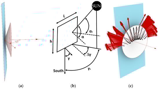 (a) The extent of the radiation cone that has a lower probability of creating unwanted solar reflections. (b) The model for evaluating the incidence solar radiation angle. (c) Representation with, highlighted in red, the hourly annual solar positions that have the maximum probability of creating unwanted reflections.