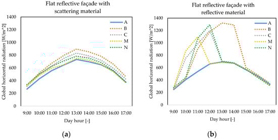In addition to the geometries, two façade finishings were analyzed which represented two possible extreme (worst- and best-case scenario) behaviors (detailed description in Section 3.1): specular and scattering.