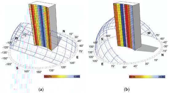 Regarding the above considerations (Section 2.3.1) on the variation of the optical performance of transparent systems, a parametric script was developed in Rhinoceros 5 [46] within the Grasshopper [47] environment to evaluate the probability of occurrences of unwanted solar reflection phenomena for a generic curtain wall surface. The script considered: the variability of the site (latitude/longitude); the orientation of the building masses; and the slope of the surfaces [55].