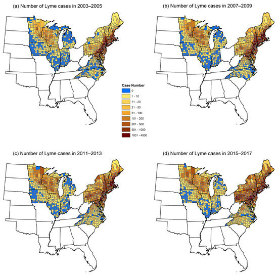 Spatial pattern of the number of human Lyme cases in 2003–2005 (a), 2007–2009 (b), 2011–2013 (c), and 2015–2017 (b).