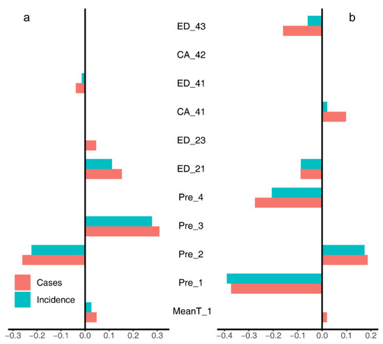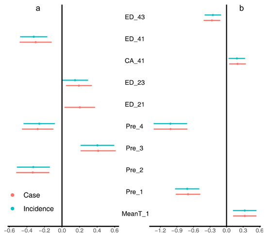 In the Upper Midwest (Figure 2a and Figure 3a), both the change of case number and incidence were negatively correlated with the changes of mean precipitation in summer (Pre_2), and the edge density of deciduous forests (ED_41); while positively correlated with the mean precipitation in autumn (Pre_3), the edge densities of open space (ED_21) and medium-intensity space (ED_23). LASSO regression (Figure 2a) also identified a negative correlation of the mean temperature in spring (MeanT_1).