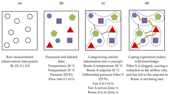 Figure 1a shows the “data” for this example—numeric values with no labels, quantity type or units (e.g., 25, 28). Information is created when the raw data are processed and structured, which in this case means the assignment of temperature units to the raw data values of 25 and 28. Additionally, notice that, at this stage, different entity types can be represented symbolically by different colored shapes. Knowledge representation (see Figure 1c) entails encapsulating the properties (i.e., isolated information) into concepts (i.e., dotted shapes) of the domain and describing how those concepts are related (gray connection lines). These relationships can indicate, for example, that Fan A serves Room A. Wisdom is gained through evaluation and rule checking about relationships in the knowledge base (i.e., see orange connection lines, Figure 1d). In this case, for example, the wisdom reveals the setpoint in Room A is not being met due to a clogged filter.