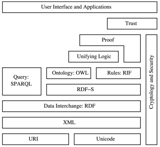 As mentioned in Section 1, in addition to ontologies, Semantic Web standards also support languages for describing ontology-driven rules (i.e., mechanisms to infer data) and queries (i.e., mechanisms to access data). For example, the shapes constraint language (SHACL) and SPARQL are semantic rule and query languages for ontologies, respectively. SHACL is a relatively recent W3C (World Wide Web Consortium) recommendation for defining constraints that can be validated against RDF graphs. The interactions between SHACL and other Semantic Web technologies are a matter of ongoing research [17]. The higher layers of the Semantic Web infrastructure include the mechanisms to ensure the proof and trustworthiness of models. Trust ensures that the source is trustworthy, and proof checks that the data come from the original source [18].