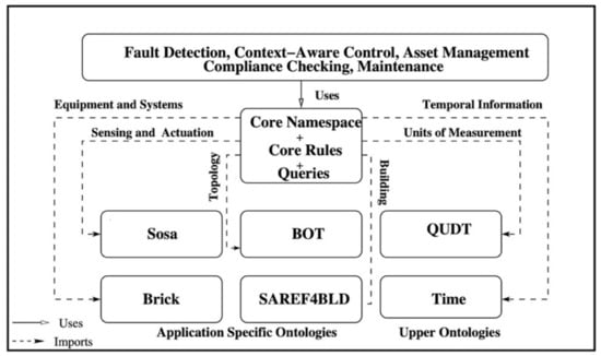 Brick Schema is a collection of semantic representations for the physical, logical and virtual assets in buildings. The Brick Schema defines a concrete ontology for sensors, subsystems and relationships among them. Moreover, it enables cross-vendor representation of the various subsystems in modern buildings in the different domains of HVAC, lighting, fire and security [23]. One study tested Brick for building management systems (BMSs) in six diverse buildings with sensors and equipment from different vendors [24]. The test coverage systematically included a range of completeness and expressiveness criteria to represent all metadata information (e.g., location of sensors, type contained in the building’s BMS) and capture all important relationships between data points (e.g., explicit or implicit) mentioned in a building BMS.