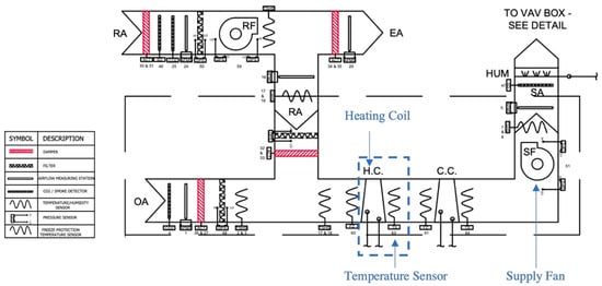 An air duct system with highlighting the heating coil, temperature sensor, and supply air fan in the image with a blur font color.