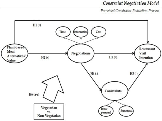 Value, which refers to the advantages of a product or service consumed, has been analyzed in numerous studies. It is interchangeable with motivation and is the most representative predictor of consumer behavior [38,39]. Hence, this study employed constraint negotiation theory to examine the causal relationships between the PBMAs’ value, individual negotiations (time, information acquisition, and cost), constraints (intrapersonal and structural), and restaurant visit intention.