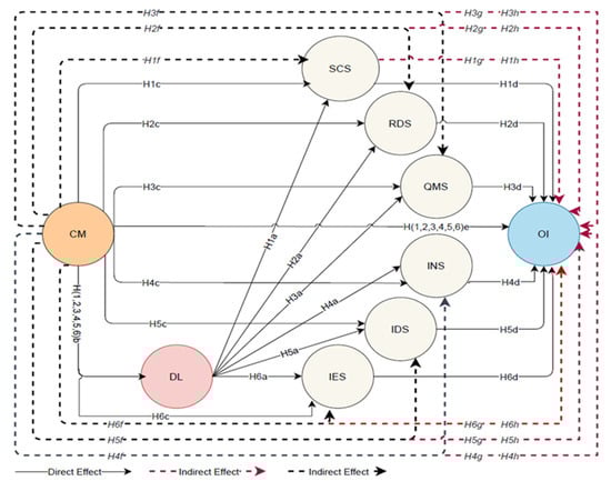 An indirect effect of CM on IES via DL was detected in the established model [β = 0.03; S.E: 0.01; t: 2.7; p < 0.001; H6f]. Similarly, an indirect effect of CM on OI over IES was achieved [β = 0.40; S.E: 0.04; t: 9.32; p < 0.001; H6g]. Another indirect specific effect was detected on the OI of CM via the IES and DL pathways [β = 0.02; S.E: 0.01; t: 2.6; p < 0.01; H6h].