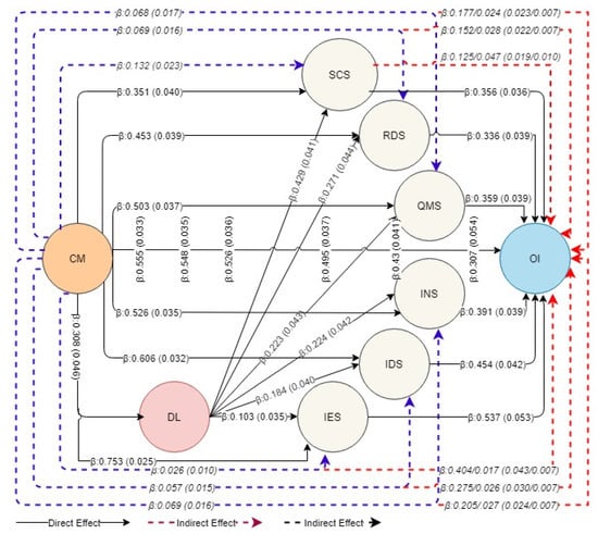 An indirect effect of CM on IDS over DL was detected in the established model [β = 0.06; S.E: 0.02; t: 3.79; p < 0.001; H5f]. Similarly, an indirect effect of CM on OI via IDS was detected [β = 0.28; S.E: 0.03; t: 9.29; p < 0.001; H5g]. Another indirect specific effect was detected on the OI of CM via the IDS and DL pathway [β = 0.03; S.E: 0.01; t: 3.55; p < 0.001; H5h].