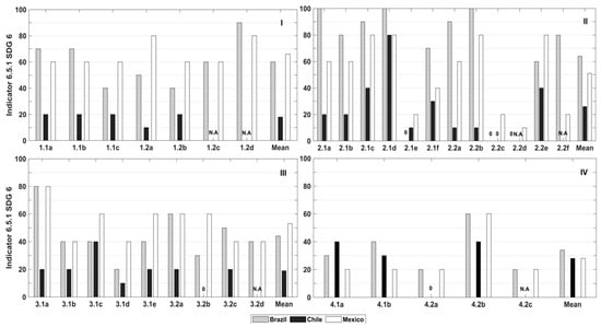 Based on the above, a data matrix with a valuation of each indicator for SDG 6.5.1 was generated for each country. To integrate each principle in the OECD Governance framework, the values of the relevant SDG 6.5.1 indicators were averaged. Subsequently, the resulting values were averaged using the same scales to determine each corresponding governance dimension. Graphs were generated as a result of the correlation between both approaches and the performance evaluation scores of Mexico, Chile, and Brazil, observed below on Section 4.
