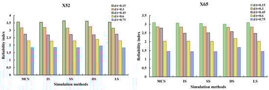 The failure probability and reliability index are also explored in relation to varied corrosion depth-to-wall-thickness (d/t) ratios. The reliability analysis findings are presented in Table 3 in terms of failure probability and g-call, and are displayed in terms of the reliability index, as illustrated in Figure 8. It can be seen that the Pf values decrease as the corrosion depth increases. This comment has previously been shown via various studies, in which findings indicated that the corrosion depth is the key factor reducing pipeline strength as it directly reduces the thickness of the pipe-walls. Unlike findings obtained by varying the operating pressure, simulation-based techniques produced more accurate Pf values for varying the corrosion defect depths. This can be attributed to the comparatively high achieved Pf values by varying d/t to varying the operating pressure. As a result, all methods use fewer g-call functions. As an example, for d/t = 0.15, the Pf values for the X52, X65, and X100 pipelines are 1.83 × 10−4, 9.96 × 10−4, and 1.77 × 10−4, respectively, but for P0 = 5 MPa, the MCS was unable to reliably establish the Pf values due to a lack of simulations. Regardless of the efficiency of the simulation approaches, DS techniques fail to produce any findings for the X100 pipeline for the same reasons stated previously. On the other hand, the LS approach produced the fewest g-calls, followed by the SS strategy, which produced correct results.