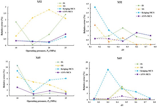 The last part explores and discusses the relative error percentage of the failure probability provided by the best simulation and meta-models approaches when compared to the reference approach (i.e., MCS). This cover IS and SS as simulation methods, as well as Kriging-MCS and ANN-MCS as meta-models. Figure 11a,b illustrate the computed relative error percentage plotted in terms of operating pressures and corrosion to wall thickness ratios. The lower the yielded relative error (%), the more accurate the approach’s failure probability outcomes. According to the acquired results, in terms of simulation-based techniques, the SS method produces results with lower relative error (%) than the IS method, and it is also more accurate in estimating lower failure probability than the IS method. As a result, it is possible to infer that, among simulation-based methods, SS may be a viable option for tackling corroded pipeline problems with lower computing costs. ANN-MCS, on the other hand, provides the least relative error compared to all other techniques, indicating its ability to obtain correct results at the lowest computational cost compared to all other approaches. In terms of operating pressures and d/t ratios, ANN-MCS generated a relative error (%) that varies between [0.27–0.8] and [0.36–1.3] for the X52 pipeline, [0.67–2.9] and [0.68–2.9] for the X65 pipeline, and [0–3.7] and [0.38–2.9] for the X100 pipeline. It is possible to infer that employing meta-models is an optimal choice for assessing the safety levels of corroded pipes with low computing effort.