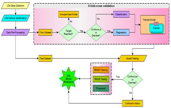 Development of the adopted linear regression algorithm was divided into the following major phases: (1) collection of related data from the Departments of Transportation (DOT), (2) defining all the factors affecting the LD, (3) sorting and processing the data to be more suitable for use in the stages of testing and training, (4) applying the concept of model development, and (5) evaluating the model performance with a model validation process. The linear regression model is illustrated in Figure 1 (where these five phases are shown) and will be discussed in the following sections. Finally, the model was validated using a 5-fold technique applied to train and test the developed model.