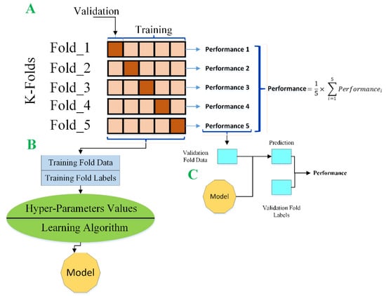 A method called K-Fold cross-validation is used to evaluate the robustness of a linear regression model [24]. First, the data in the database is subdivided into K subsets. Then, k-1 of these subsets is used as the training set, while the remaining subset is used as the testing set to measure performance, as shown in Figure 4. This process is repeated until every subset has been used as the testing set.