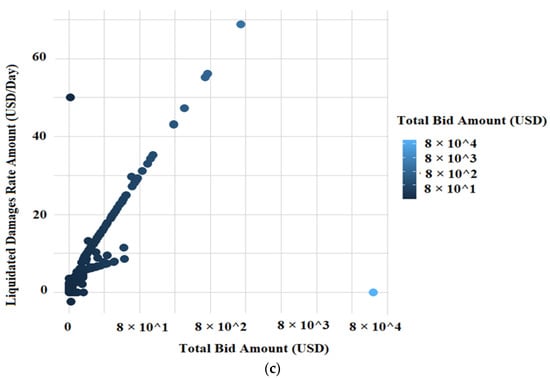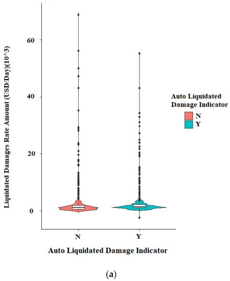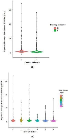 The three categorical independent variables (Auto Liquidated Damage Indicator, Funding Indicator, and Road Systems) were plotted against their corresponding Liquidated Damages (LDs) in the database, as shown in Figure 5a–c. These three scatterplot matrices show some correlation between Road System Type and LDs, but not much correlation for Auto Liquidated Damage Indicator or Funding Indicator. In addition, all three scatterplots indicate the presence of many outliers.