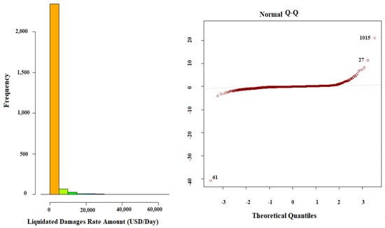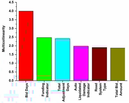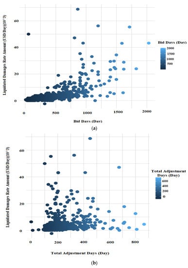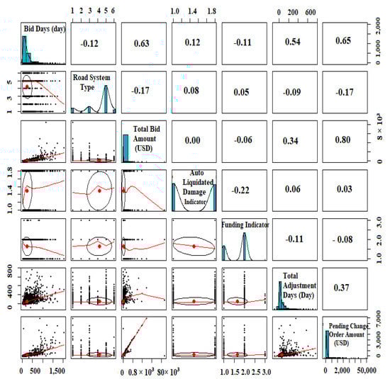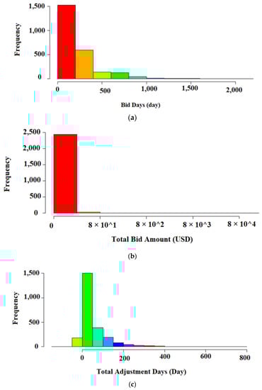 As shown in Figure 6a–c, the three numerical independent variables (Bid Days, Total Bid Amount, and Total Adjustment Days) have a strongly skewed distribution. The graph looks like a log-normal distribution, which can be defined as a distribution whose logarithm is normally distributed. It is essential to transform variables into a normal distribution to handle this problem.