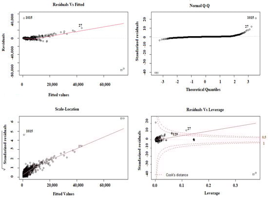 Residuals vs. Leverage is used to find values of independent variables that greatly affect the regression results, as seen when they are included or excluded from the training set. The Cook’s distance of a point measures how influential the point is in determining the model’s coefficients. It can be seen from the scale-location plot that there is a movement in the following trend, which is difficult to see on the residuals vs. fitted plot partly because some points have very large residuals, which means that the model suffers from heteroscedasticity. Running a “bptest” on the model is vital to ensure that the observation is correct. There are three points of high Leverage but no influential points. Such a point is not influential, since it falls out of the acceptable boundary between the lower and upper dashed lines, which may be taken out of the dataset to attain a model free of the influence of such a point, as shown in Figure 10, which is vital to identify the influential points considered within the analysis.