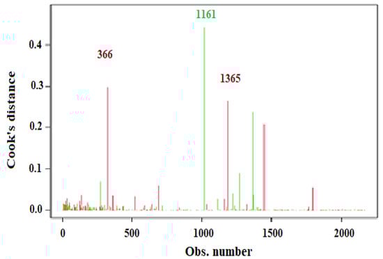 Cook’s distance was examined to check for influential data points using Influential Observations, since they have an unequal impact on the model coefficient values. Figure 11 provides a plot of Cook’s distances by observation, which flags observations 366, 1161, and 1365 as particularly influential. Dropping these observations may have a notable impact on improving the model and the intercept and slope values.