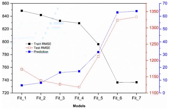 Figure 14 summarizes the results for the best-fit model. is the least flexible, and is the most flexible. Furthermore, the Train RMSE decreases as flexibility increases in , , and . These three models were described as underfitting models since they have a high Train and a high Test (A model is underfitting if there exists a more complex model with lower Test .)