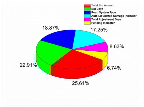 The three most influential factors were the Total Bid Amount, Bid Days, and Road System Type. The influence of the Total Bid Amount can be explained because LDs are usually quantified as a percentage of the overall project cost. Therefore, as the total project cost increases, the LDs would be expected to increase. The influence of the Bid Days can be explained by the fact that project duration significantly influences LDs, as projects with longer durations have higher costs. Finally, the influence of the Road System Type can be explained by the fact that the road system plays a key role in determining the rules and regulations adopted by the entity that funds the project. Federal regulations must be followed when the project is a federal or interstate highway, while state regulations must be followed for state and county highways.