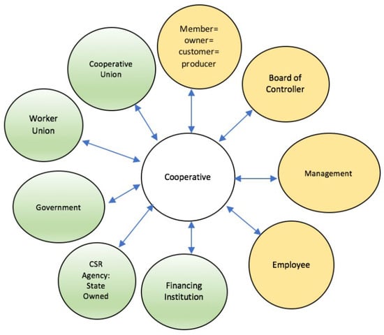 Stakeholder theory is frequently applied to understand the factors that influence the success of cooperatives and small and medium businesses []. Internal and external stakeholders are also present in cooperative business enterprises. Cooperatives are hybrid organizations that maximize value, instead of profit. They are owned, governed, and controlled by their members []. Therefore, in cooperatives, members play a role as owners, as consumers, and also as producers [,]. In Indonesia, the highest decision is at the annual meeting of members according to the Law of the Republic of Indonesia Number 17 of 2012 []. The role of the owner, who usually provides venture capital, is replaced by membership dues. Koperasi Setia Bakti Wanita in Indonesia collects funds from all its members to build a new building and is willing, for five years, not to receive profit from business proceeds, in order to buy their second building []. Figure 1 explains the cooperative stakeholder. The yellow circle represents the internal stakeholder and the green one represents the external stakeholder. All stakeholders have an important role, but as the research focus and objective, only government and members are discussed in this research.