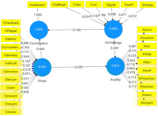 Having all these elements in mind, the teachers agree to contribute to AI’s implementation in HEIs. The Cronbach’s alpha analysis shows that the questionnaire items were appropriate for our analysis, as the sub-items for the reflective variables AIutility (0.924) and Contribution (1) had values higher than 0.7, the bottom line, as shown in Figure 1 and Table 2.