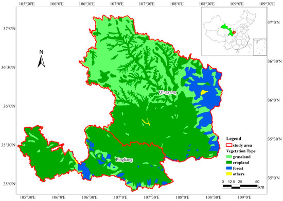The study was conducted in the cities of Pingliang and Qingyang located in eastern Gansu Province in northwest China (Figure 1), which includes 14 counties with an approximate area of 3.84 × 104 km2. This area is known as the transition ecotone of the grassland-cropland ecosystem in China. The most important land cover and land use types are grassland, cropland, and woodland. Cropland and woodland constitute the dominant land use and land cover types in the southeastern region, while the northwestern region is dominated by grassland. The climate of most of the land features a typical semiarid zone with annual rainfall of around 400–600 mm and annual temperature fluctuating between 7.5 and 11.4 °C. Rainfall has been identified as a crucial factor affecting yield of crops; however, precipitation often experiences great changes from year to year, which leads to a large range of variation in outputs of rainfed cropping systems [24].