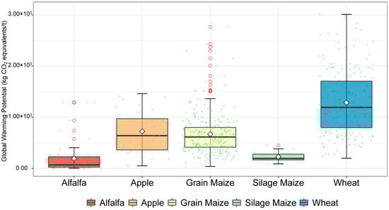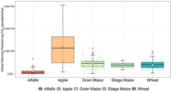 Greenhouse gas emissions per ha produced by five dominant crops in the study area: alfalfa, apple, grain maize, silage maize, and wheat. The square, middle line, and red dot represent the average value, median, and outlier, respectively. Note: some outliers were omitted to ensure that some of the boxes were not over-compressed.