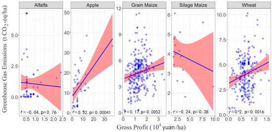 The Pearson correlation coefficient was adopted to describe the relationship between CF and margin of each crop. As shown in Figure 6, correlation between CF and gross profit was moderately positive for crops of apple, grain maize, and wheat (p < 0.01), but the association of alfalfa and silage maize was not significant (p = 0.76 and p = 0.38). Nevertheless, CF was inversely correlated with net profit for crops of alfalfa and wheat (p < 0.01), positive for apple (p < 0.05), and not significant for grain maize and silage maize (p = 0.36 and p = 0.45) (Figure 7). The results suggest that correlation varied both among cropping systems and with statistic index, factors such as household management practices and natural conditions play a potential role in explaining the variation in CF and economic performance of cropping systems, but most studies agree that the goal of improving profitability does not adversely affect the CF of agricultural products [16,18,32,33].