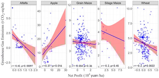 Correlations between greenhouse gas emissions and net profit of alfalfa, apple, grain maize, silage maize, and wheat. The color band is the 95% confidence interval.