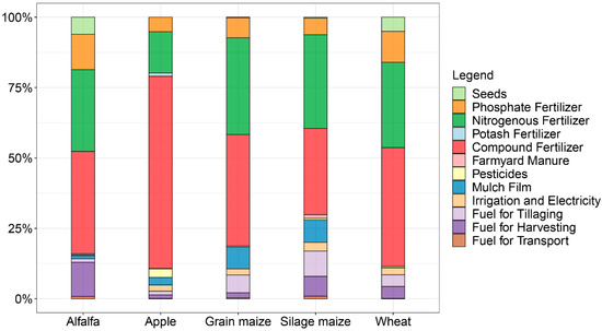 The results revealed that great differences existed in the sensitivity of different material inputs and processes (Figure 8). Among five types of crops, the greenhouse gas emissions from growing apple had a high inventory sensitivity in the production and use of compound fertilizer, accounting for 68.29% of its gross emissions. Regarding grain maize and wheat growing, the inventory sensitivity focused on compound fertilizer and nitrogen fertilizer, accounting for 39.47% and 42.03%, 34.30% and 30.22% of its gross emissions, respectively. For the forage crops, the results also showed a higher sensitivity on the fertilizer application. Production as well as field emissions of compound and nitrogen fertilizers constituted silage maize and alfalfa’s total emissions, were 30.61% and 36.32%, 33.33% and 29.06%, respectively.