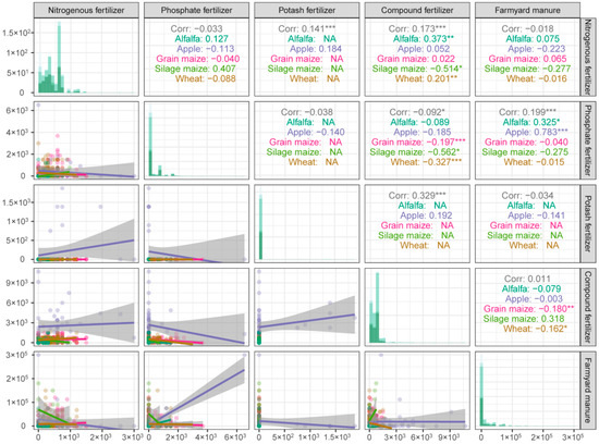 The main reason for the excessive use of chemical fertilizer is that farmers lack accurate science-based guidance related to using chemical fertilizer. According to the principle of reasonable fertilization, there should be a substitution effect in the use of different fertilizer types. For instance, there should be a negative correlation between the amount of compound fertilizer and other fertilizers or between organic fertilizer and other fertilizers. Figure 9 illustrates the correlation analysis of fertilizer inputs for nitrogen, phosphorus, potassium, compound, and organic fertilizers used in the production of the five crops analyzed in this study. Negative correlations were only found between compound and nitrogen fertilizers used in silage maize production and between compound and phosphorus fertilizers as well as between compound and organic fertilizers used in wheat and grain maize production. The compound and nitrogen fertilizers used in producing alfalfa and wheat showed a positive correlation, meaning the inputs were irrational. Nevertheless, as a high-quality fertilizer, organic fertilizer has a good effect on reducing the carbon footprint of crop production. For example, the greenhouse gas emissions caused by the use of organic fertilizer for apple, grain maize, wheat, silage maize, and alfalfa accounted for only 0.08%, 0.17%, 0.18%, 1.28%, and 0.38% of the total emissions, respectively [48]. Studies showed that choosing the appropriate combination of organic and chemical fertilizers to replace the use of only a single chemical fertilizer can ensure crop yield while reducing greenhouse gas emissions [49,50]. Under reasonable fertilization scenarios, organic fertilizer can replace part of the chemical fertilizer used in production, so the use of these two fertilizers should show a negative correlation. However, the results in Figure 9 show that when organic fertilizer was applied, farmers still used an excessive amount of chemical fertilizer so that the amount of chemical fertilizer used did not decrease significantly. The use of organic fertilizer only had a negative correlation with the use of compound fertilizer in the production of wheat and grain maize.