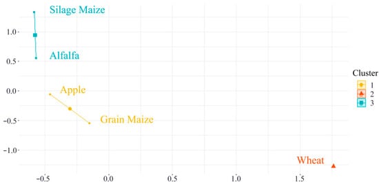 In terms of clustering analysis results, the five crops can be divided into three clusters (Figure 10), including crop with poor comprehensive performance (wheat) and crops with a better comprehensive performance (apple and grain maize), as well as a best performance (alfalfa and silage maize). This indicates that planting apple, grain maize, and wheat will result in a higher cost of greenhouse gas emissions in order to obtain the same profit compared with the other two crops. Moreover, similar to Xia et al., the CF of wheat production in Gansu Province is higher than the national average [57], mainly due to the excessive fertilizer input by farmers attempting to increase production and low output efficiency [58,59]. In particular, the profit ratio of wheat in eastern Gansu was low and its competitiveness was weaker when compared with the other four crops analyzed here. Similarly, in agreement with Ren et al., the production efficiency of grain maize in northwest China was low while the labor input was high. However, the unit yield was insufficient and the use of excessive amounts of nitrogen fertilizer was common, resulting in high levels of greenhouse gas emissions [60,61,62].
