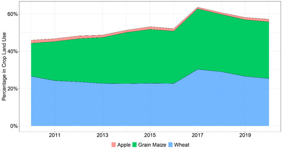 Land use change in wheat, grain maize, and apple production in the study area for 2010–2020. Note: Alfalfa and silage maize were not included due to a lack of statistics in the early part of this period.