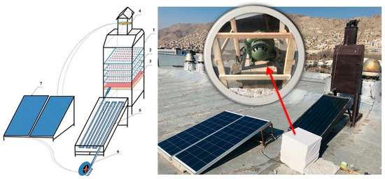 Schematic description of solar dryer: 1—drying chamber, 2—drying trays, 3—air distributor, 4—DC exhaust fan, 5—collector, 6—DC centrifugal blower, and 7—PV solar panel.