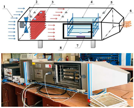 Convective batch laboratory tray dryer scheme: 1—air inlet, 2—centrifugal blower, 3—heater, 4—drying trays, 5—sensors, 6—air outlet, 7—balance load cell force, and 8—drying chamber.