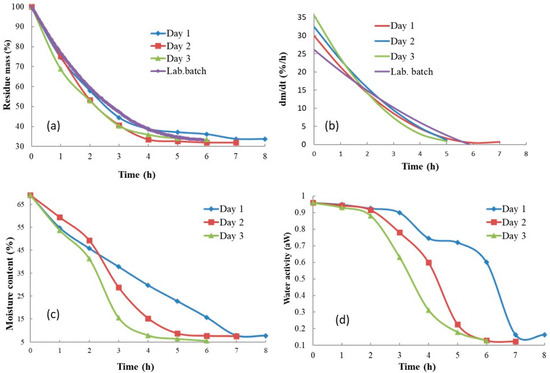 Figure 3 shows the rate of the sample mass loss in all three solar experiments compared to the reference laboratory batch experiment, as well as the sample moisture content and aw behavior during the solar drying process. This analysis was carried out with non-autoclaved samples. Compared to the laboratory batch dryer, the mass loss curves (Figure 3a) in the solar dryer were not smooth as they showed fluctuations caused by the change in weather during the day. In solar dryer experiments, the initial drying rate was higher than in the laboratory batch experiment; however, it dropped more rapidly and reached lower values after 2 h (Figure 3b). Differences were also visible between the experimental days. The slowest mass loss and highest equilibrium moisture content were recorded on the first experimental day, while the most rapid mass loss and lowest equilibrium moisture content were measured on the third experimental day. The effect of weather changes during the day and between the experimental days is easily visible in Figure 3c, where the product moisture content is presented, and in Figure 3d, which shows product aw. On the first experimental day (Day 1), the final aw and final moisture content were reached ca 2 h later than on the last experimental day (Day 3). Unfortunately, the convective laboratory batch experimental device did not enable sampling for moisture content and aw measurement during the experimental run. However, measured aw at the end of the experiment was in the same range as that for solar drying experiments.