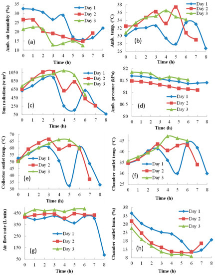 The decrease in sun radiation (Figure 4c) caused a rapid decrease in the ambient air temperature (Figure 4b), collector outlet temperature (Figure 4e), and air flow rate (Figure 4g). Consequently, the drying chamber outlet temperature (Figure 4f) decreased, and ambient air humidity (Figure 4a) and chamber outlet air humidity (Figure 4h) increased. A similar scenario with smaller fluctuations was repeated on Day 2. However, no clouds appeared, and the sunshine reached its maximum at 2 PM on Day 3. The air relative humidity was the lowest and the ambient air temperature, collector outlet temperature, chamber outlet temperature, and air flow rate were the highest of all three days. These favorable conditions led to drying time shortening by 2 h. As seen in Figure 4d, changes in ambient pressure during the experimental day were not significant; however, due to the high altitude of the geographical location, the atmospheric pressure was between 81 and 82 kPa.