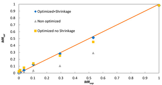 As a first estimate, the effective diffusion coefficient was determined from the slope of the linear equation (Equation (6)) for both solar and laboratory batch experiments. These values are marked in Table 2 as non-optimized. In the case of the solar dryer, the values of Deff varied between 6.1 × 10−10 and 8.9 × 10−10 m2 s−1, while for laboratory convective batch dryer, it was 3.1 × 10−10 m2 s−1. The determined values of Deff were used in Equation (4), applying n = 10 to calculate moisture ratio (MRcal). Significant differences were found when comparing MRcal with experimental moisture ratios (MRexp) (Figure 5) for non-optimized Deff due to the use of only one member of the infinite series (n = 0) in Equation (4) for Deff estimation. To obtain a better fit of the calculated MRcal to MRexp, Deff was optimized by minimizing the sum of deviation squares between experimental and calculated values using Equation (4). The obtained results are shown in Table 1 as “Optimized shrinkage not considered”. As shown in Figure 5, these values provide a much better description of the experimental data; however, the deviation between MRcal and MRexp is not negligible.