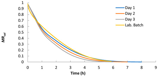 Using Equation (4) with n = 10 and “optimized shrinkage considered” Deff from Table 1, the moisture ratio (MR) was calculated for all solar and laboratory convective batch experiments. As seen in Figure 6, the decrease in Deff from 2.81 × 10−10 m2 s−1 to 2.33 × 10−10 m2 s−1 in the solar dryer led to the prolongation of drying time by more than one hour. The decrease in Deff was caused by the change in ambient conditions (increased air relative humidity, decreased temperature and air flow rate).