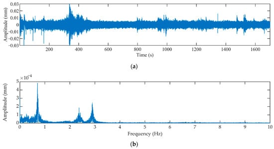 The vibration sensor 891-4, made by the Institute of Engineering Mechanics (CES), was used to test the vibration of the bridge’s rotating structure. This sensor was installed at the end of a cantilever of the rotating structure to measure the vertical vibration time history. The vibration test lasted 1780s, during which all horizontal rotation processes occurred. The sampling frequency was 255 Hz. The time and frequency domain distributions of the tested vibration data are shown in Figure 5.