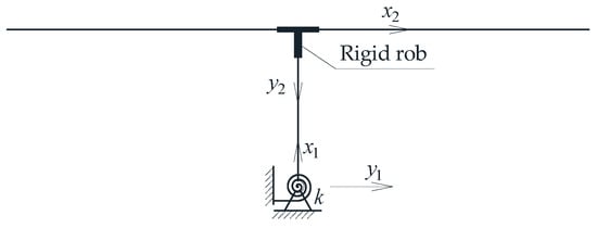 We deduced the analytical formula for calculating the pier-bottom bending moment M based on the acceleration a in the first two asymmetrical vibration modes. The first step was to simplify the rotating structure to a T-shape structure (Figure 6). In particular, the pier and the girder of the rotating structure were simplified to an infinite freedom degree straight rod with infinite axial stiffness. The shear deformations of the pier and of the girder were ignored. The top of the pier and the gravity center of the girder were connected by rigid rod; moreover, the bottom of the pier was hinged to the ground and connected with a rotational spring with stiffness k. For convenience, in the formula the pier is indicated as “rod 1” and the right cantilever beam as “rod 2”. Since it was assumed that the deformations of the left and right cantilevers were antisymmetric in the first antisymmetric vibration mode, the left cantilever was not numbered. The original position of rod 1 in the local coordinate system was at the pier bottom. The positive direction x1 corresponded to the up direction, while the positive direction of y1 corresponded to the right direction. The original position of rod 2 in the local coordinate system was at the cantilever’s support. In this case, the positive direction x2 was the right direction, while the positive direction y2 was the down direction.