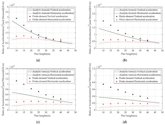 Furthermore, the ratio of the vertical acceleration at the end cantilever () and the horizontal acceleration at the pier top () to the bending moment of the pier bottom can be obtained by substituting and – into Equations (20)–(22):