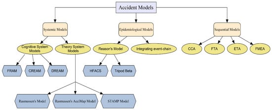 Generally, there are three categories of accident models: sequential, epidemiological and systemic models [46]. The classification of these models and their subset methods are illustrated in Figure 1.