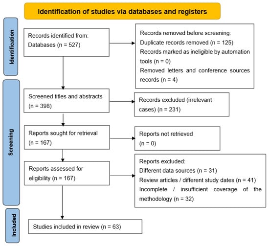 According to the study plan, 527 records were collected, as shown in Figure 1. Prior to performing screening, 125 duplicates and non-English papers, along with four letters and conference proceedings were excluded from the first list. The anthology of results was then reduced to 398. It should also be noted that this study focused on the research literature that were consistent with our methodology, study goals, and method of application. Additionally, papers that combined alternative methodologies with systemic models to improve their findings were considered. We excluded 167 studies after an examination of the remaining abstracts in terms of relevance. A more thorough analysis of the selected publications’ methods and results sections resulted in the elimination of a further 64 papers. Eventually, 63 papers were selected for conducting the analyses in the current study. The results of the search are depicted in the PRISMA flow diagram (Figure 5). Furthermore, as shown in Figure 6, the frequency of 63 systemic methods studies were presented. Accordingly, among 25 AcciMap studies, seven papers were published from the years 2003 to 2010 and 18 works were published from 2011 to 2021. This frequency for 16 STAMP studies in similar ranges was 1 and 16 with a higher frequency in 2018. For 22 FRAM studies, the frequency was 1 and 21, with a higher frequency in 2021. Overall, considering the trend of using these methods, the number of articles increased from 2016, which indicated their capability to understand the behaviors of complex sociotechnical systems.