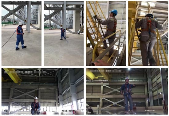We found that these images did not reflect the real environment in the workshop, so we collected images from the workshop. Some of the images were taken with an iPhone, with a resolution of 480 × 800. Others were obtained from the workshop monitoring video, with a resolution of 1920 × 1080. The brightness of the environment, the distance between the worker and the lens, the posture of the human body, and the angle of the lens were considered in the process of acquiring images. Figure 2 shows a selection of this dataset.
