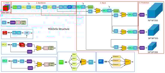 Pr(object) indicates the size of the probability that this bounding box contains the object; when the bounding box is the background, the value is 0. On the contrary, when the bounding box contains the object, the value is 1. IOU (intersection over union) indicates the accuracy of the bounding box, expressed as the intersection ratio of the predicted box to the actual box. The size and position of the bounding box is characterized by four values of (x, y, w, h), (x, y) is the center coordinate of the bounding box, and w and h are the width and height of the bounding box. In addition, each cell also needs to give the predicted C categories probability value; each cell needs to predict (B × 5 + C) values, so the final prediction is a tensor of size S × S × (B × 5 + C) []. We choose YOLOv5s, one of the four versions of YOLOv5. Figure 3 shows the structure of the YOLOv5s network model [], its structure consists of four main parts, namely input, backbone, neck, and prediction []. The backbone network is a convolutional neural network that extracts image features, and the neck network performs feature fusion using the FPN (feature pyramid network) algorithm and the PAN (pixel aggregation network) algorithm [].