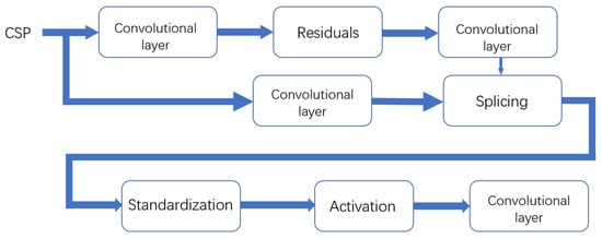 Compared to the YOLOv4 algorithm, YOLOv5 adds a focus structure to the backbone network and adaptive image scaling to the input side. In common object detection algorithms, different images have different lengths and widths, and the common approach is to scale the original image to a standard size uniformly, and then the image is fed into the network. In practice, the size of the black edges at both ends of the scaled image are different, which affect the inference speed once more information is filled. Therefore, YOLOv5 adaptively adds the least amount of black borders to the original image, increasing the reasoning speed. In addition, the backbone network uses the CSP (cross stage partial) structure in YOLOv4, and two CSP structures are used in YOLOv5. CSP1_X structure is applied to the backbone network, and CSP2_X structure is applied in the neck network to enhance network feature fusion. YOLOv5 uses CSPDarknet (cross stage partial Darknet) as the backbone network for feature extraction. CSPDarknet is the combination of the CSP structure [] and the Darknet network. In the object detection problem, the use of CSPNet brings a larger boost to the backbone, effectively enhancing the learning capability of CNN, while reducing the computational effort. The CSP structure is shown in Figure 4.